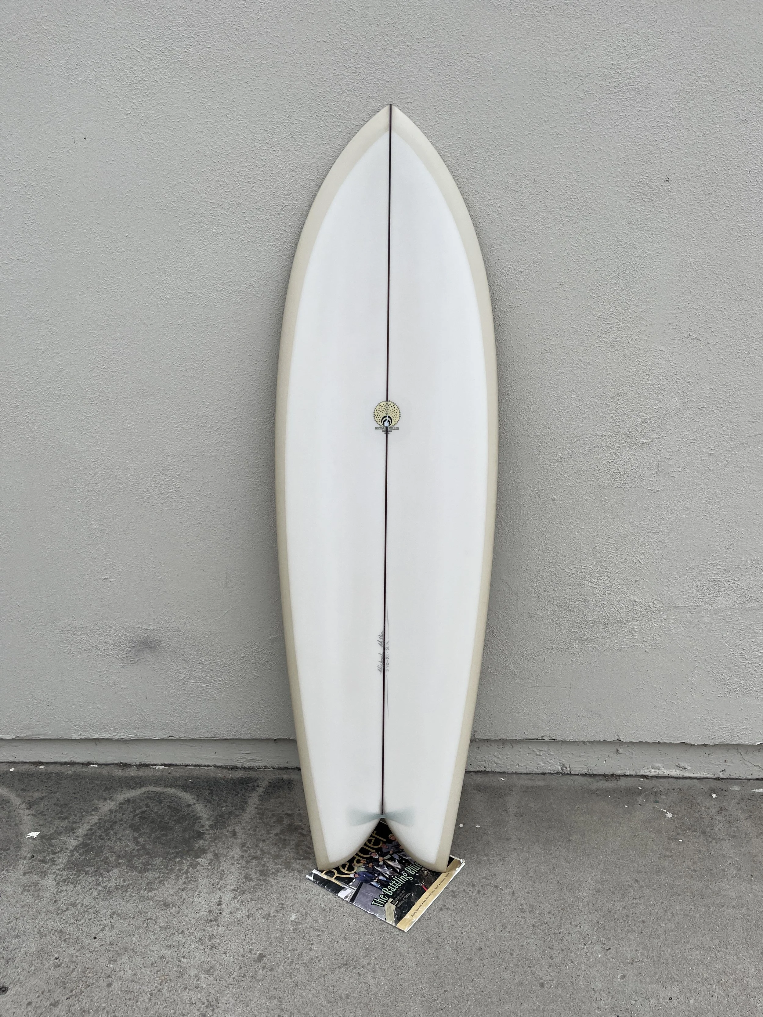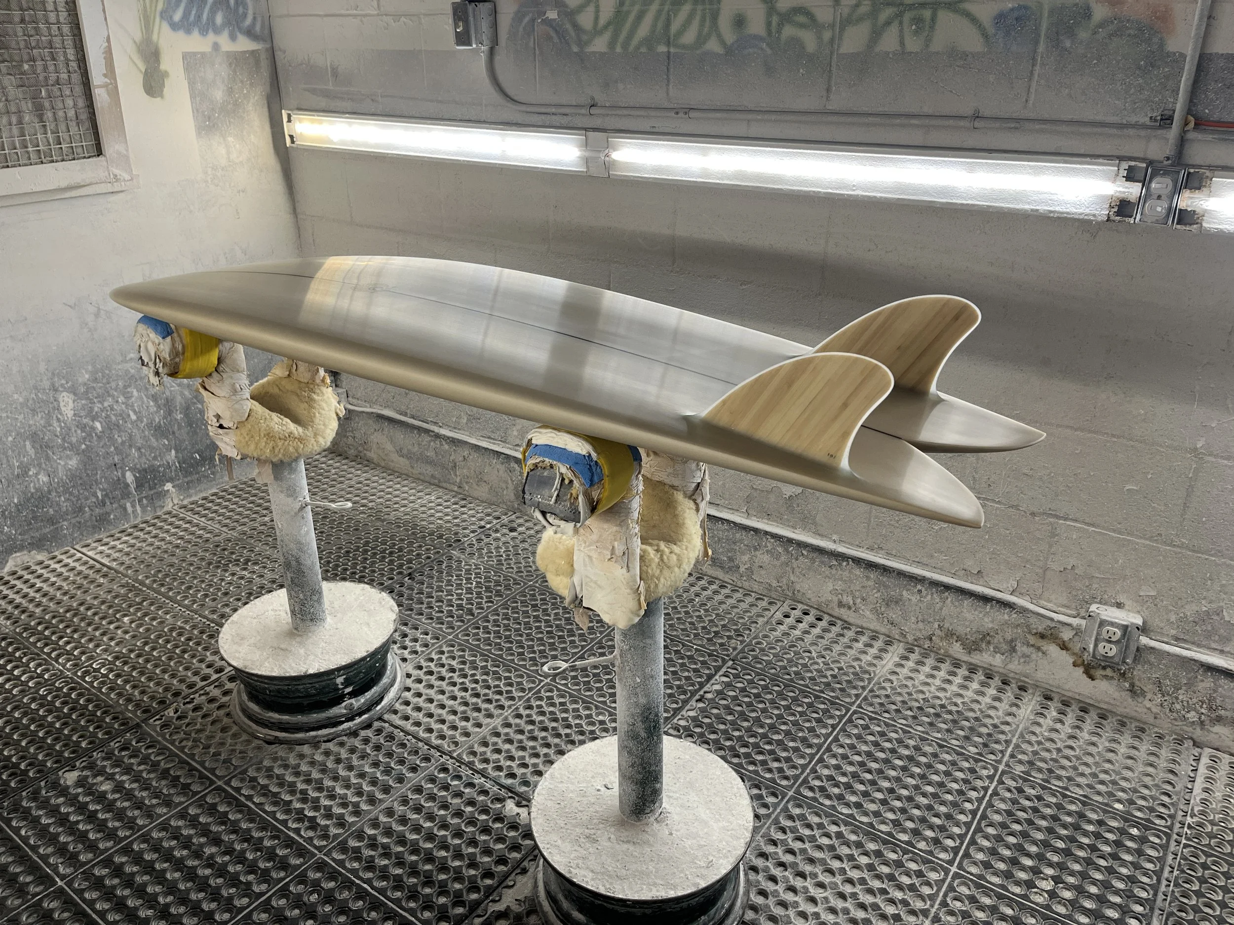 1/8” dark wood strringer, glass on bamboo keels, both sides beige tint, resin leash loop and sanded gloss