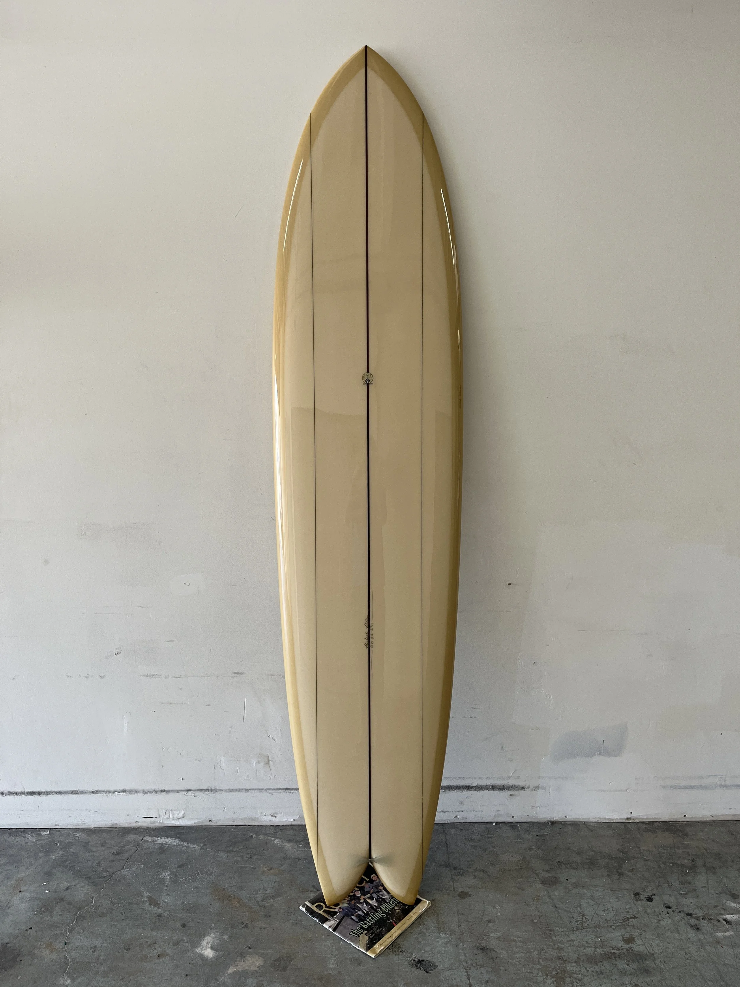 3/16” dark wood stringer ply 2 black glue lines, tri fin FCS, both sides sand tint, resin leash loop and polished gloss
