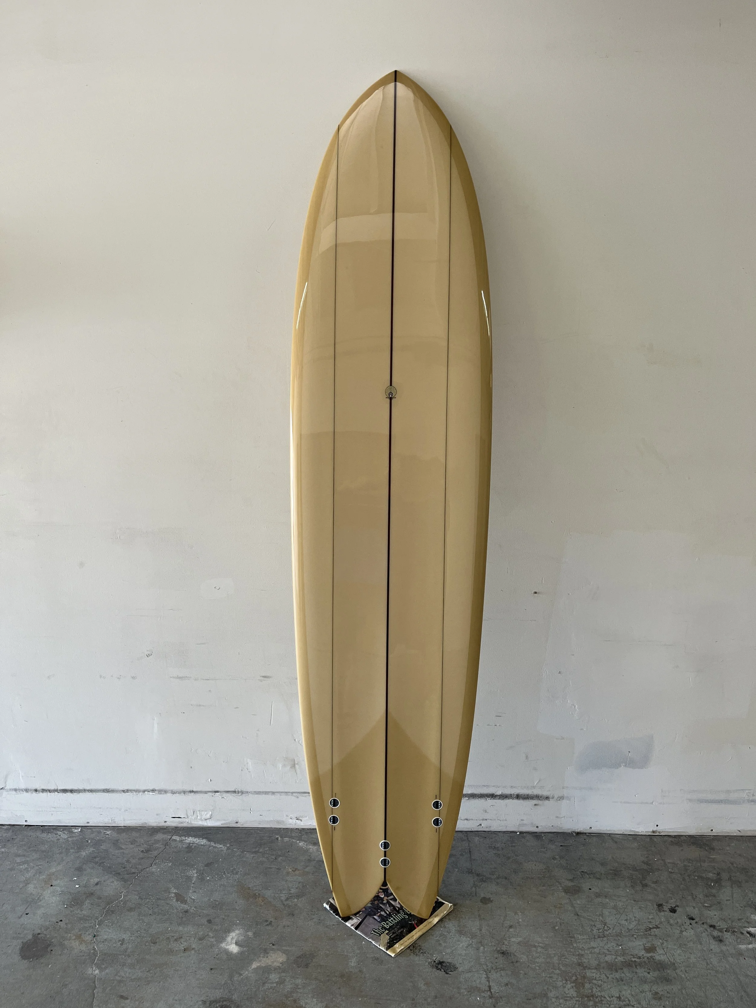 3/16” dark wood stringer with 2 black glue lines, tri fin FCS, both sides sand beige tint, resin leash loop and polished gloss